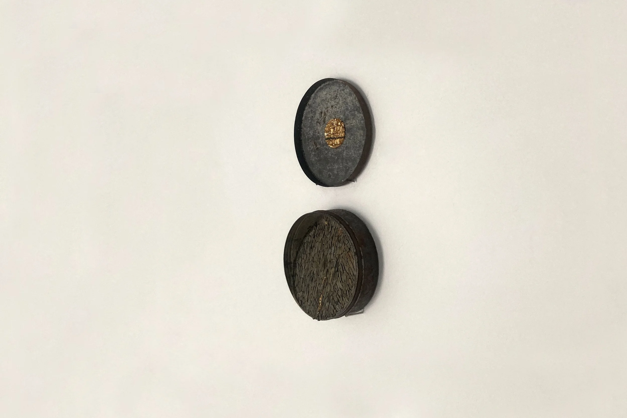 Sun rises in the East, slate stone, golden smalti on decayed metal | 11 x 11 x 3,5 cm | 2020