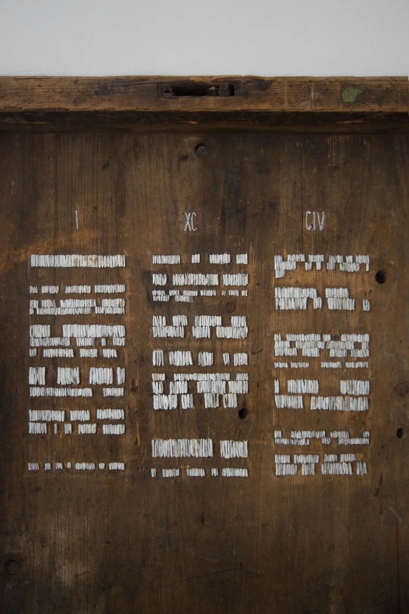 Installation; paintings made with natural earths, mosaics on decayed objects (collected from abandoned urban areas), and artefacts of the creative process.