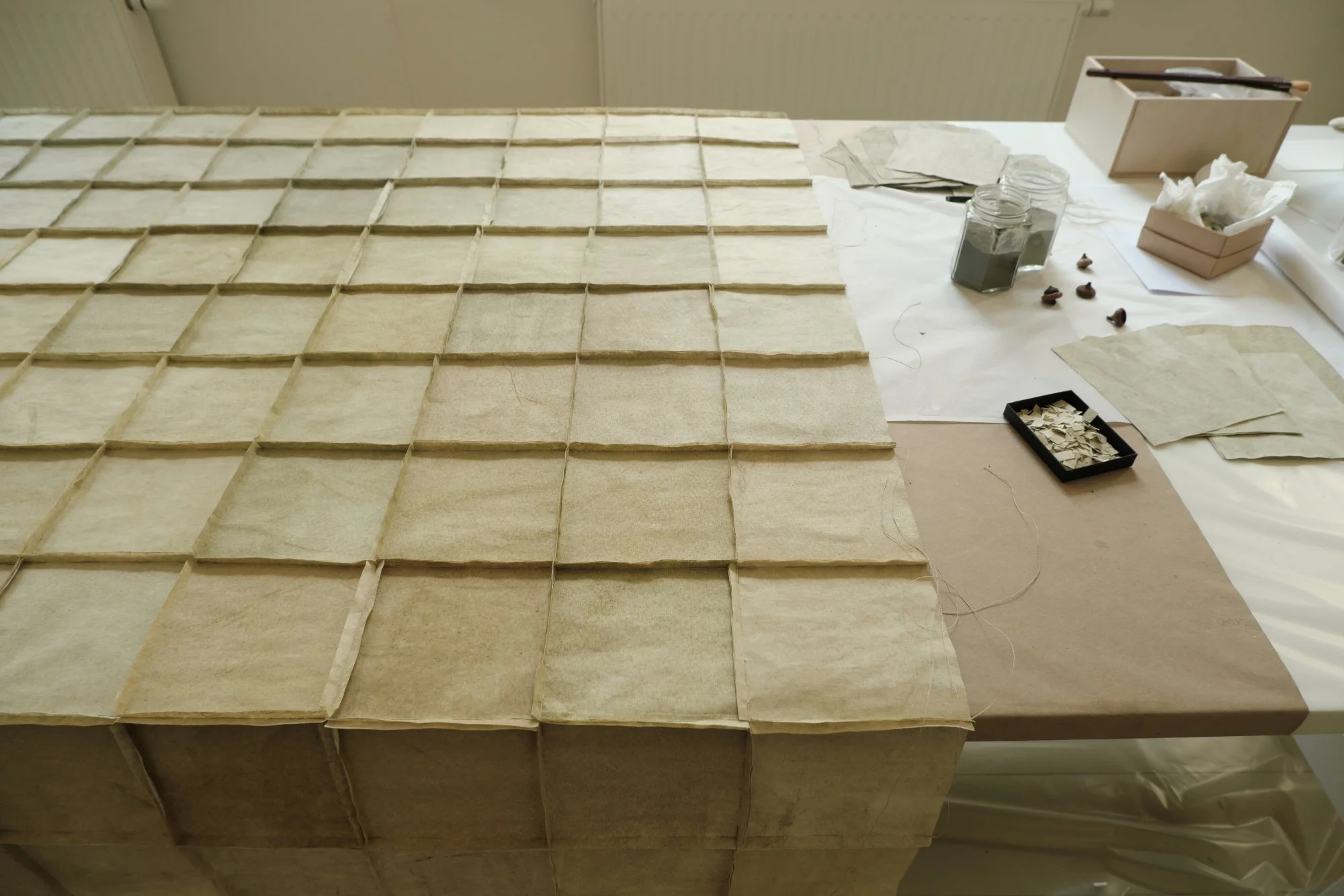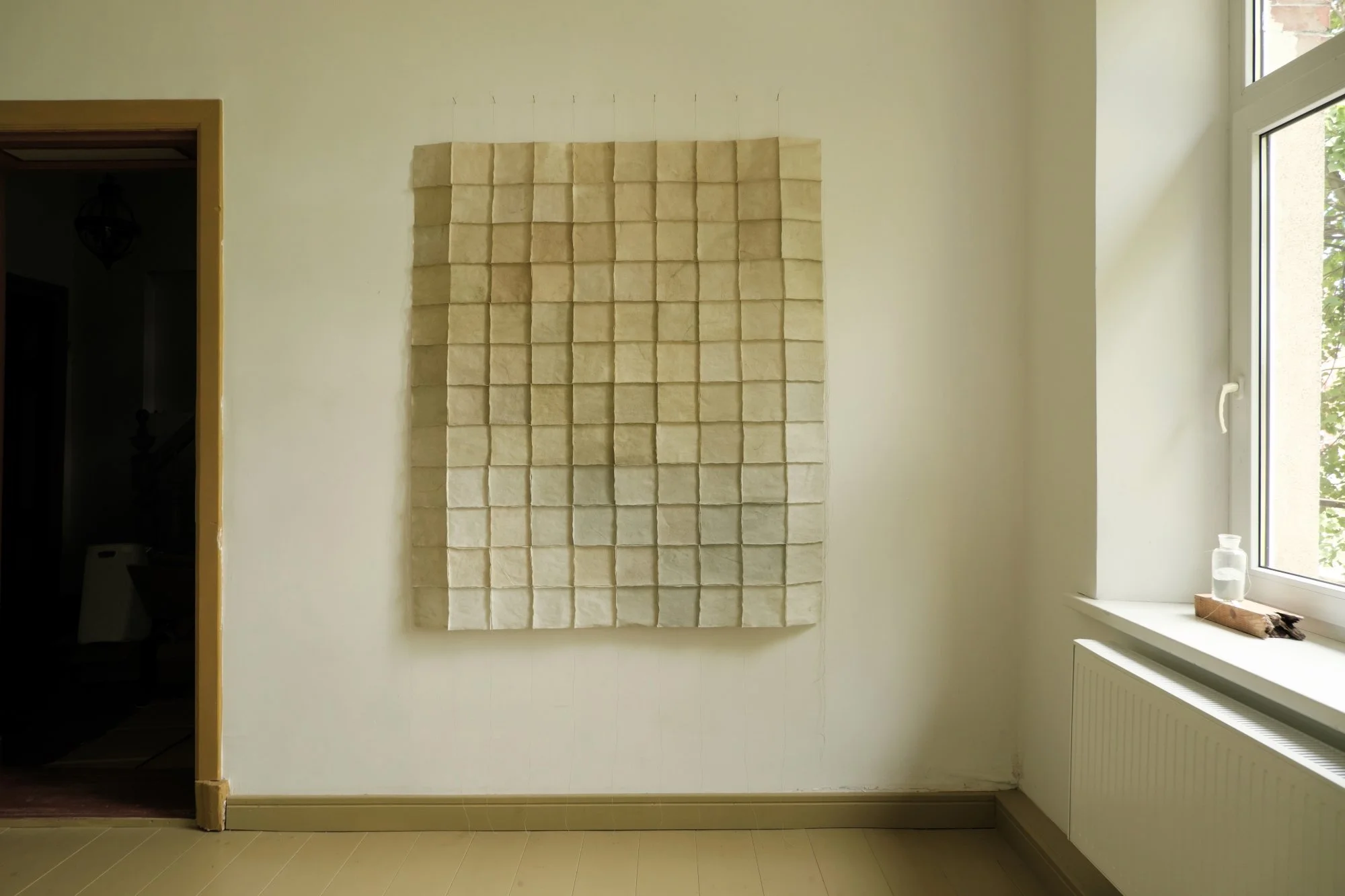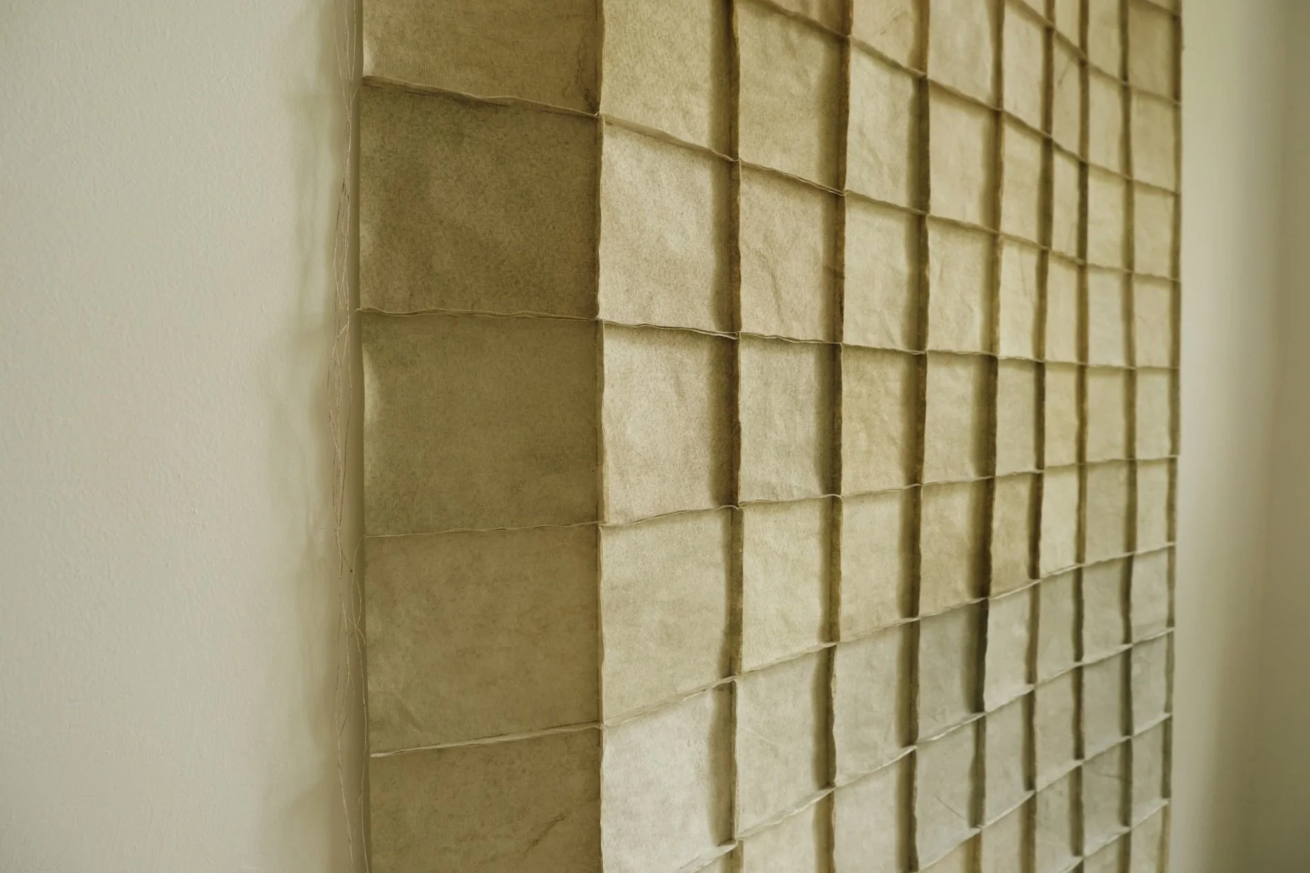 terra verde pigments on cotton paper, linen threads / 155 x 135 cm