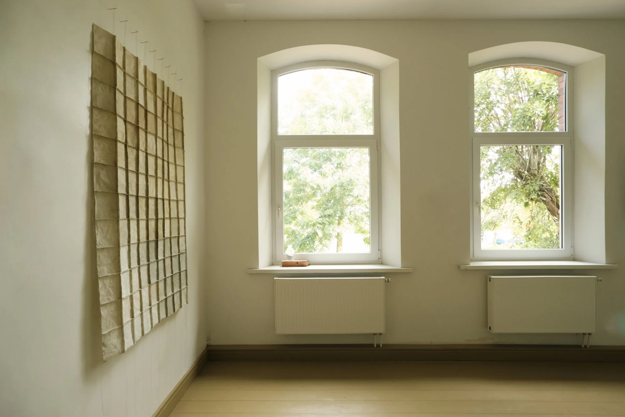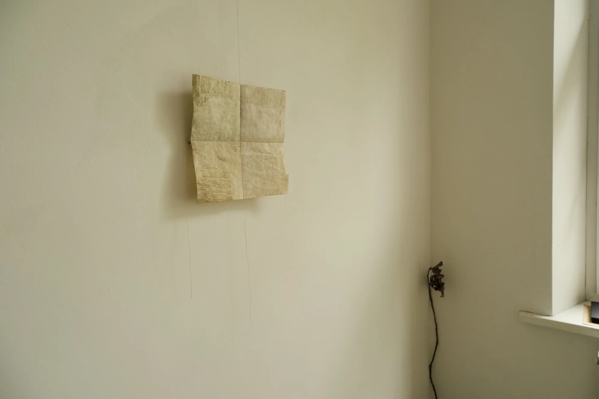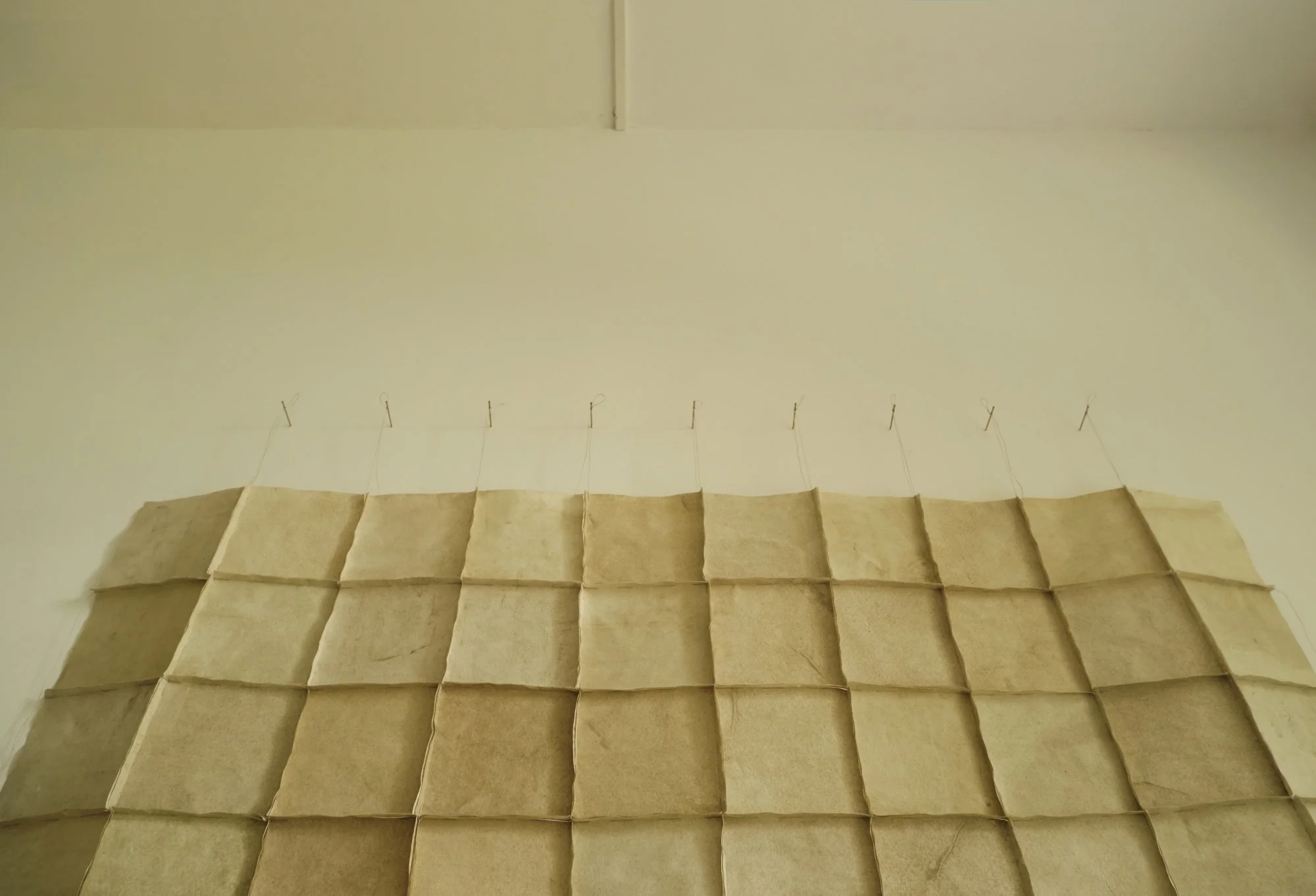 terra verde pigments on cotton paper, linen threads / 155 x 135 cm